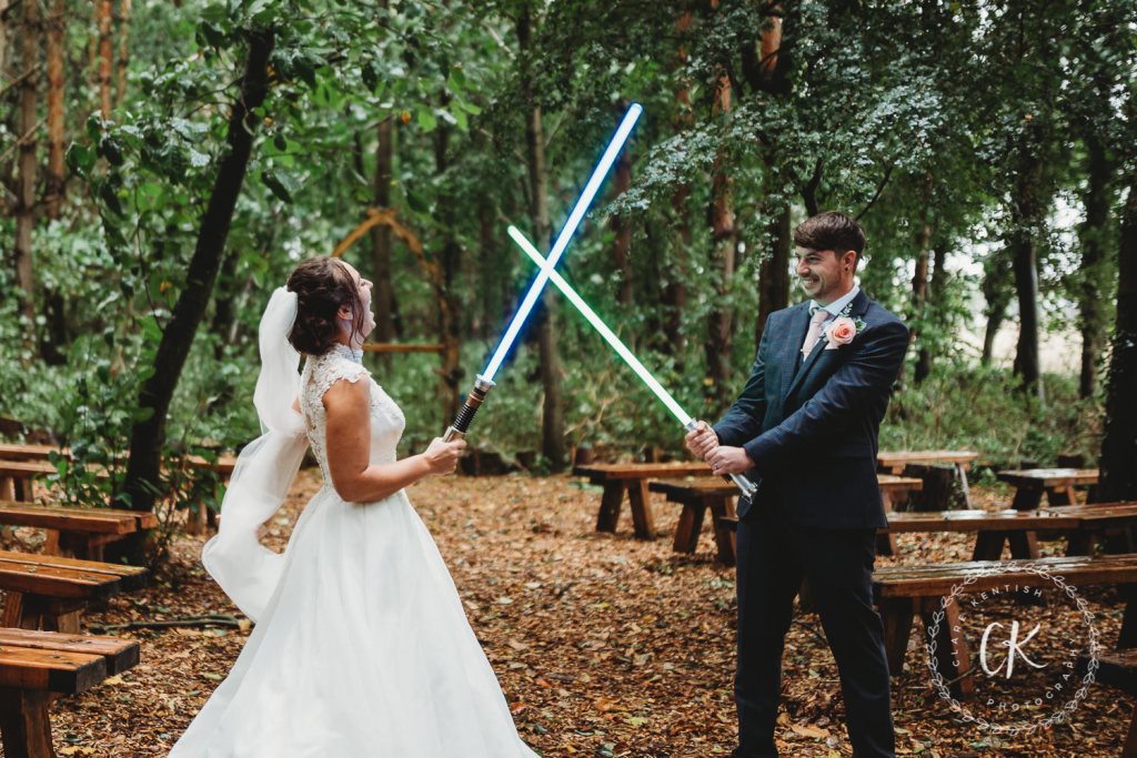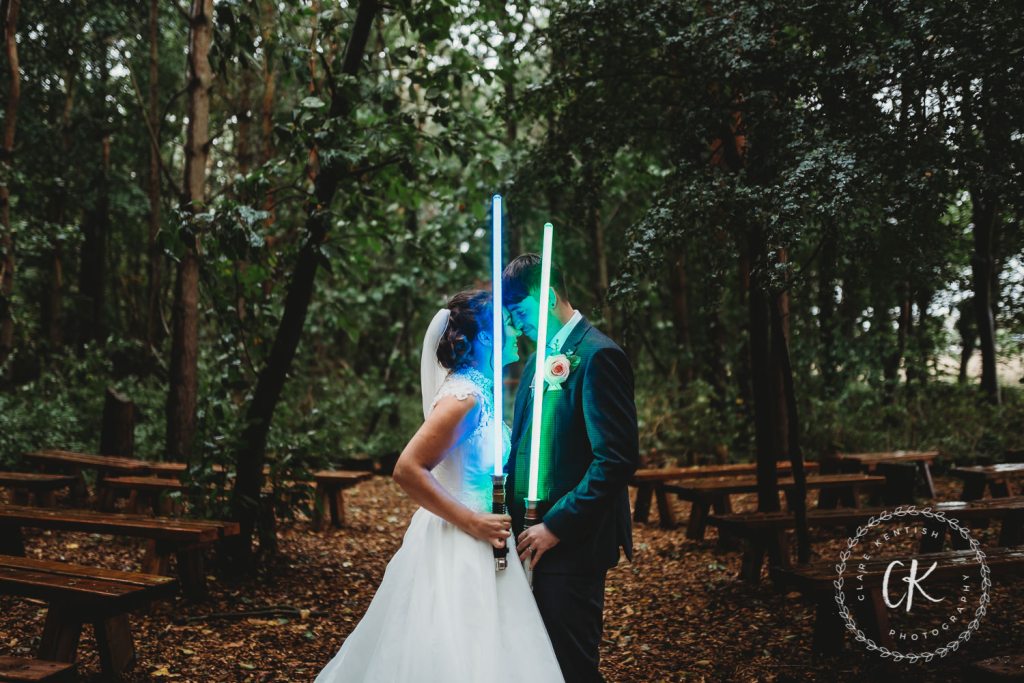 Then we tackled the rain by doing confetti & groups in the beautiful ceremony barn at AMOE and more photos in the woods, this time with light sabres ;) before heading for BBQ food and the most awesome dessert tower! Yum!