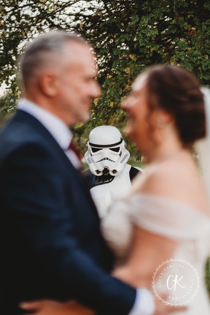 Carl also let me know of a few surprises he had in store, like his Flower Boys (Men), Stormtrooper and Carl’s own entrance to Adam & The Ants – Prince Charming. I had Dave with me on the day as second shooter / bubble gun holder / drinks fetcher / bag carrier. He’s a massive Star Wars fan (can be seen most days in one of his many subtle Star Wars t-shirts). I decided not to tell him about my new friend Stormy (pretty sure that’s not his name) so when the Stormtrooper arrived Dave had a good ol’ giggle too. As did the guests when they saw him for the first time walking down the aisle. One of my favourite photos (possibly ever) if Stormy holding Sam’s flowers. It’s a shot serious photographers do with the Bride, looking down at her flowers, all flowing and lovely, but I think I prefer it with a Stormtrooper. Actually everything is better with a Stormtrooper (unless you’re part of the Resistance I suppose).